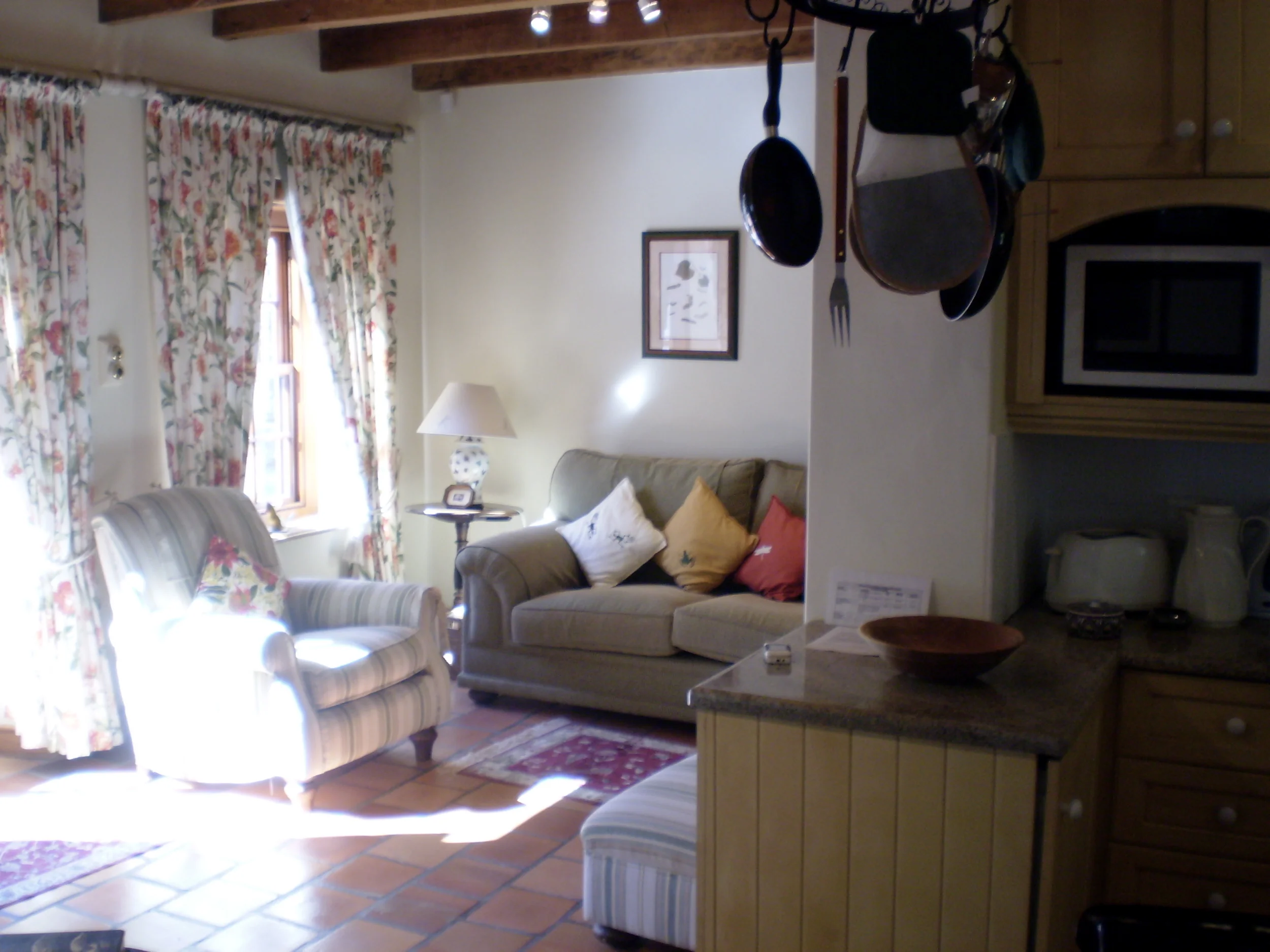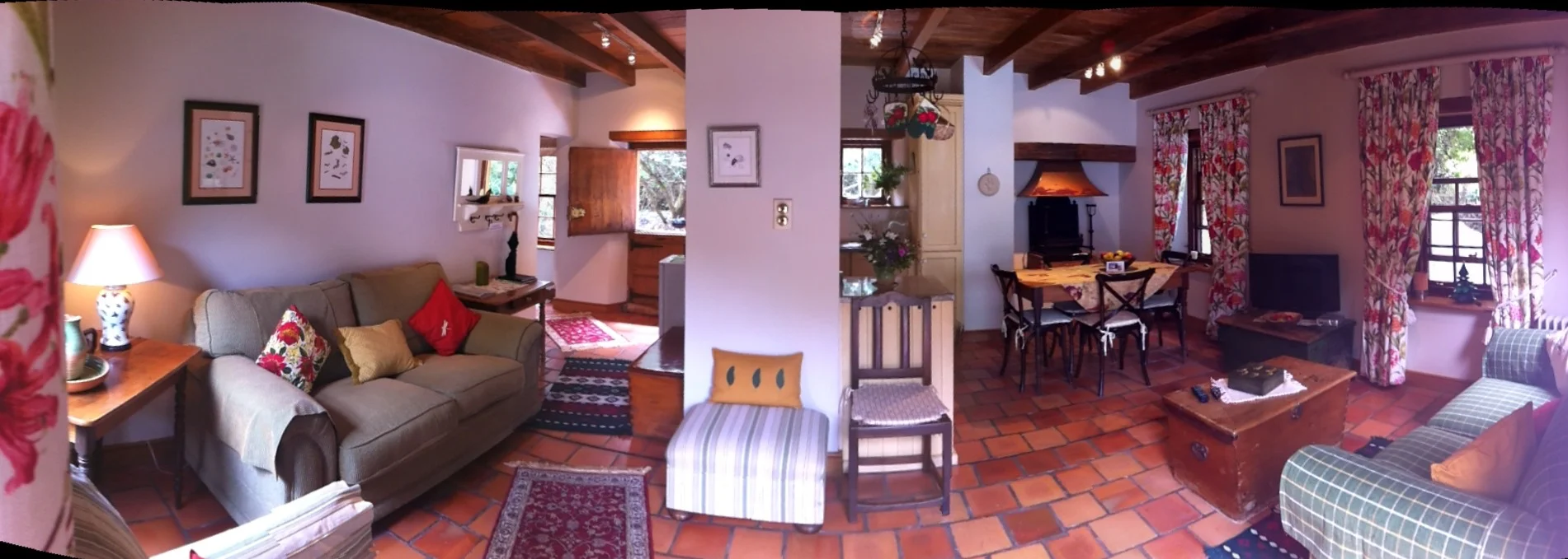 These provide not only our guests' garden shade, but also much bird activity. We sometimes see a spotted eagle owl in these trees, as well as kynsna louries, Cape white eyes and green pigeons, all attracted by the ripening figs in summer. In September the flowering orange clivias in the garden beyond are a feast for your eyes. A few years ago even a pair of rare tree hyraxes (tree dassies) was spotted from the Fig Tree verandah.